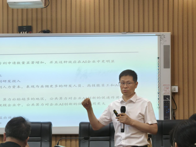 余明桂在讲座中详细介绍了公共算力对中小企业AI创新的影响。他指出,公共算力能够显著增加中小企业的AI专利申请数量,并且这种效应在AI企业中更为明显。余明桂进一步阐述了公共算力的三大作用机制:降低中小企业的算力使用成本、激励企业将更多资金投入到研发中、以及激励企业将更多资金投入到人力资本中。此外,余明桂还探讨了公共算力影响的异质性,他发现在算力规模较大、算力补贴较多的地区,公共算力对企业AI创新的促进作用更为显著;在企业特征方面,公共算力对民营企业和小规模企业的AI创新促进作用更大。余明桂还通过进一步分析发现公共算力可以产生AI创新的溢出效应,并提高企业的全要素生产率(TFP)。